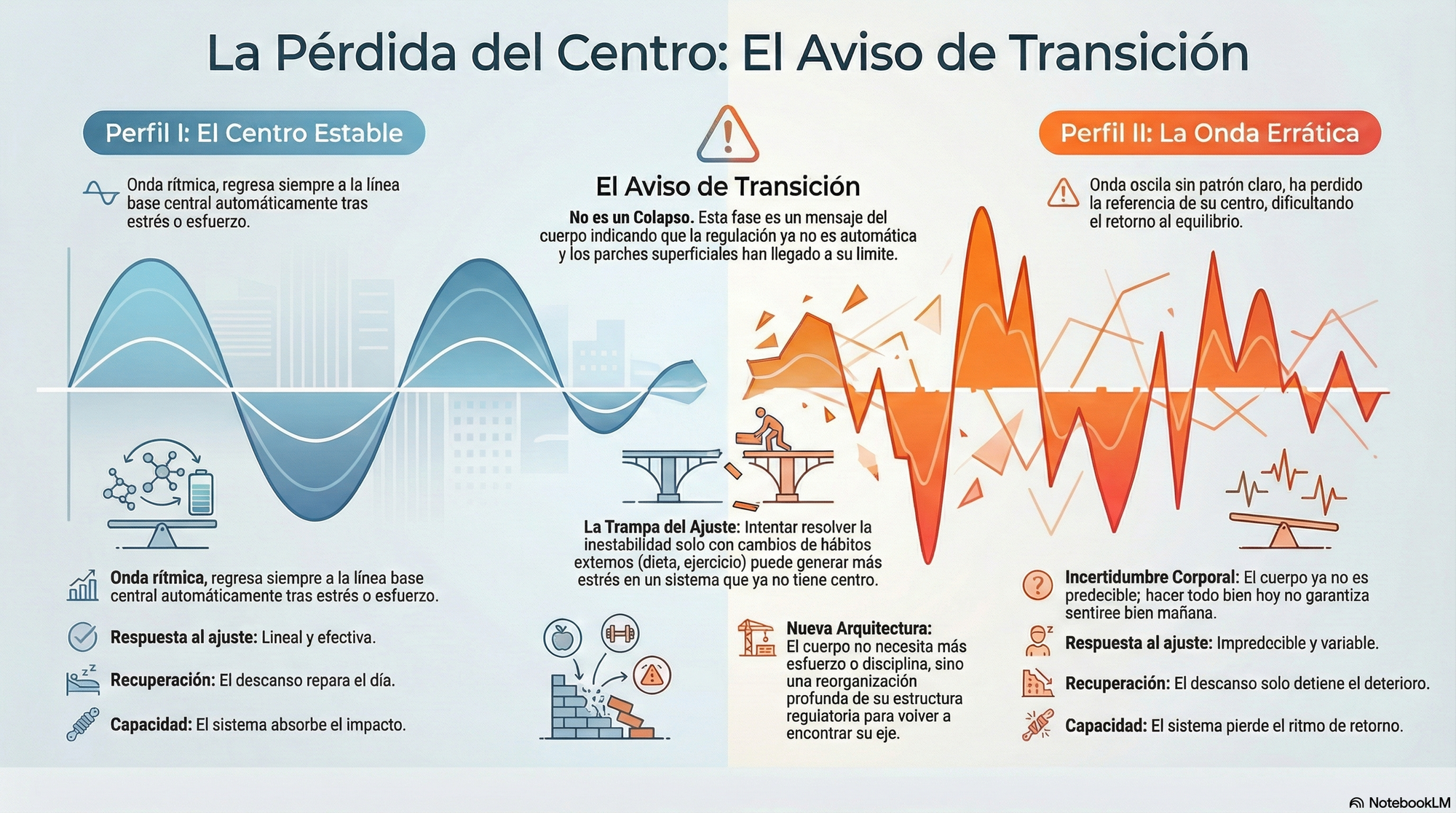 No estamos ante un colapso catastrófico, sino ante un cambio de lógica biológica. Como indica la fuente: "No es un colapso, es un aviso de transición: el cuerpo no se desregula de golpe, primero pierde el ritmo que le permitía volver por sí mismo". En consecuencia, el error clínico prevalente es intentar "ajustar más fuerte", tratando al sistema como si todavía fuera un Perfil I funcional, cuando en realidad el contexto ha comenzado a dominar al sistema debido a la erosión de sus referencias internas.