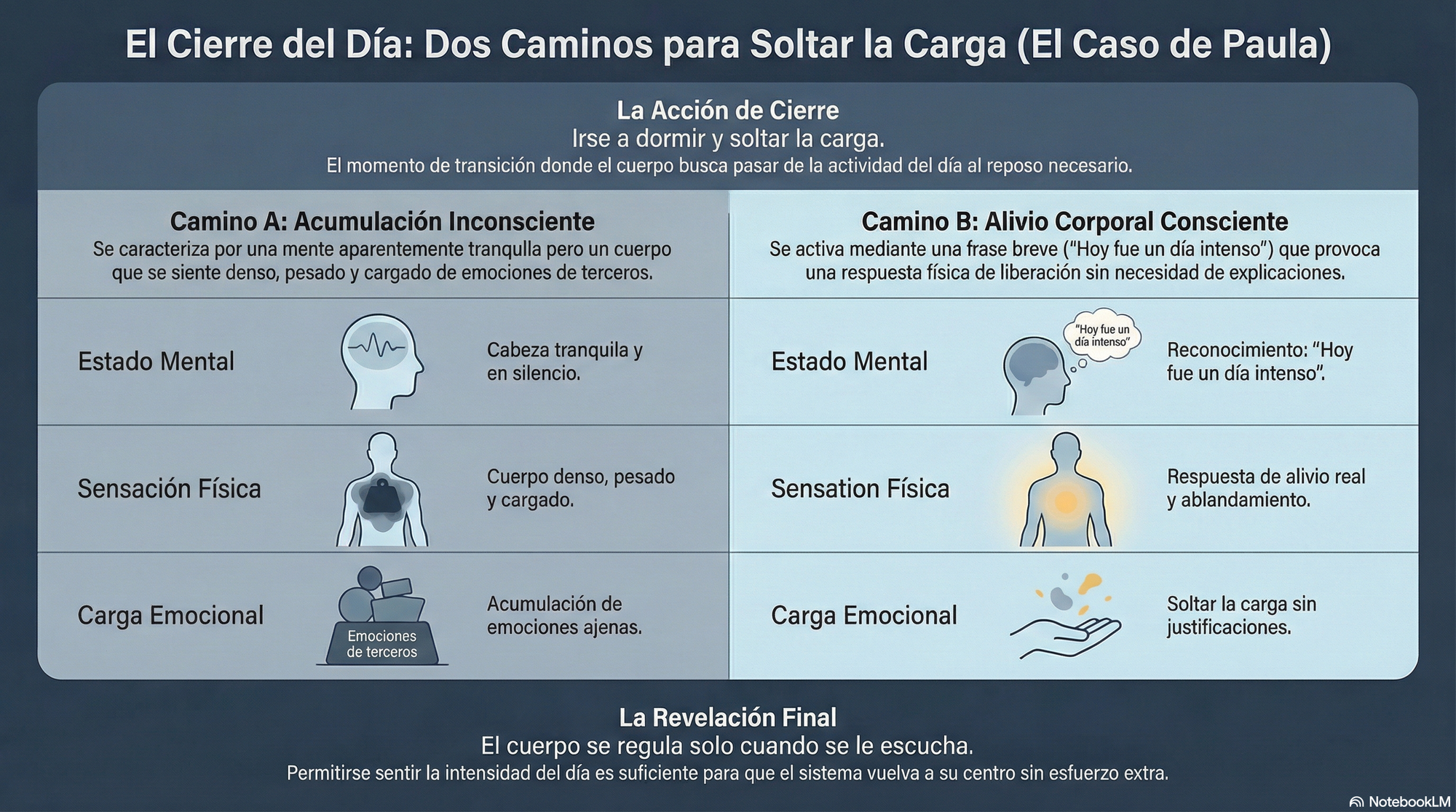 Acumulación nocturna | La mente está en silencio, pero el organismo permanece en un estado de carga alostática. No hay pensamientos, pero existe un peso físico que impide el apagado del sistema. | El acto de reconocimiento biológico al nombrar la intensidad ("Hoy fue un día intenso") permite que el sistema nervioso reconozca el final del ciclo, produciendo un alivio real y profundo. |